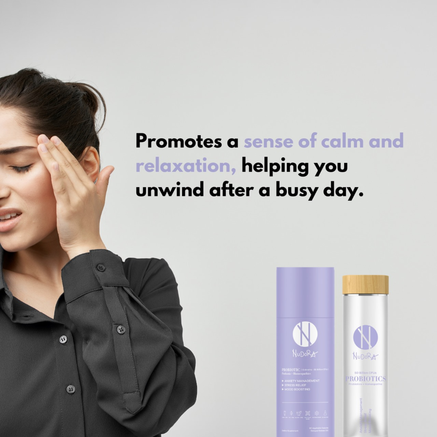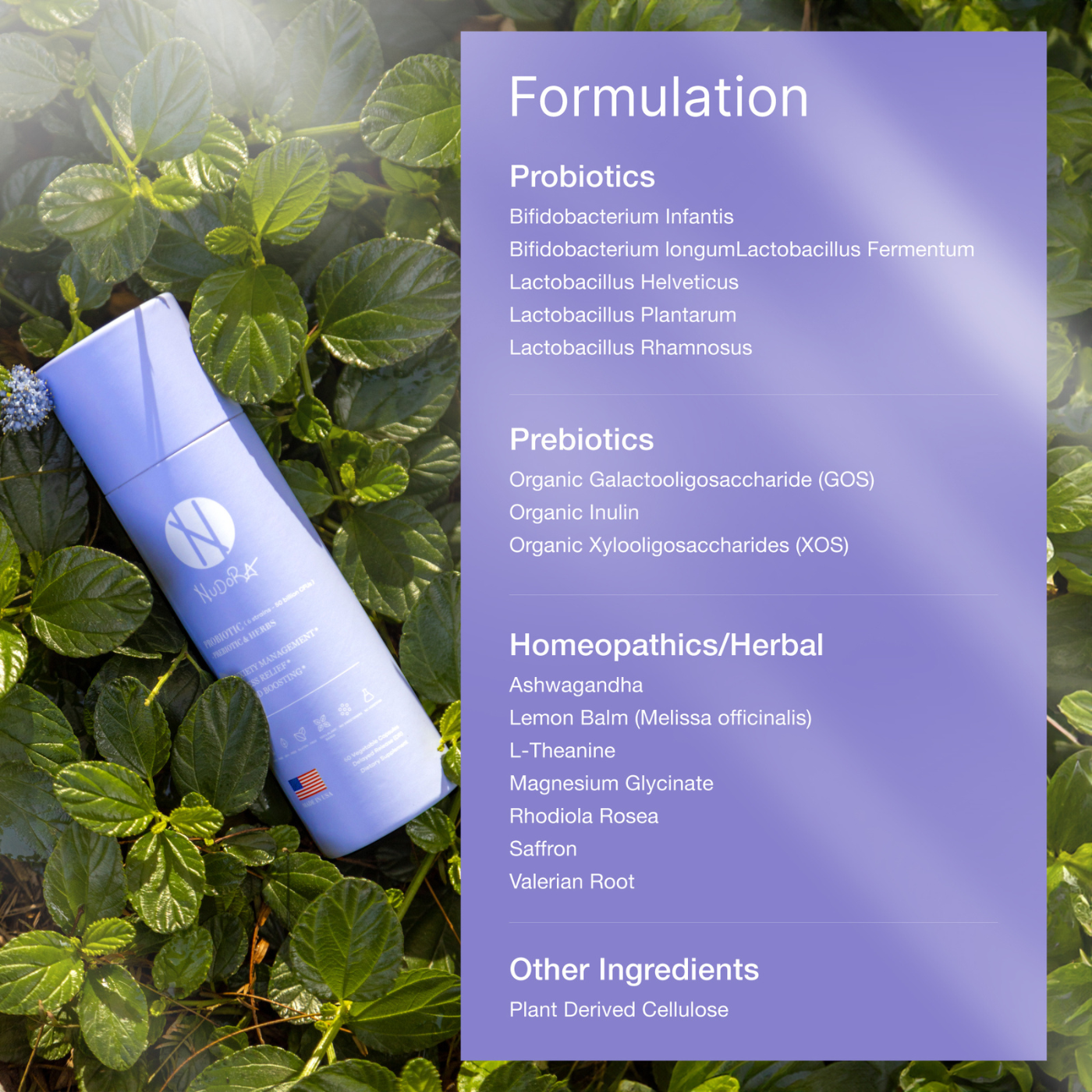 Combina hierbas que alivian el estrés como Ashwagandha con probióticos para una solución completa para la mente y el cuerpo.