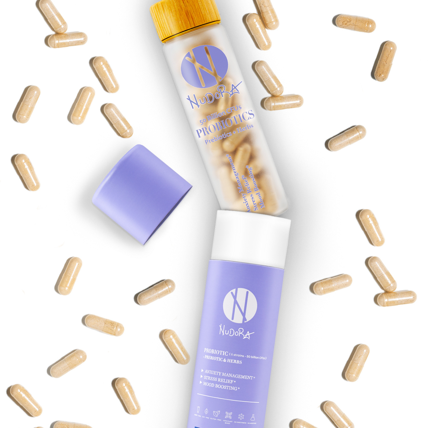 R: ¡Sí! Nudora Purple combina probióticos con hierbas calmantes como la ashwagandha y la raíz de valeriana, para que obtengas apoyo para el intestino y el estrés en un solo producto.