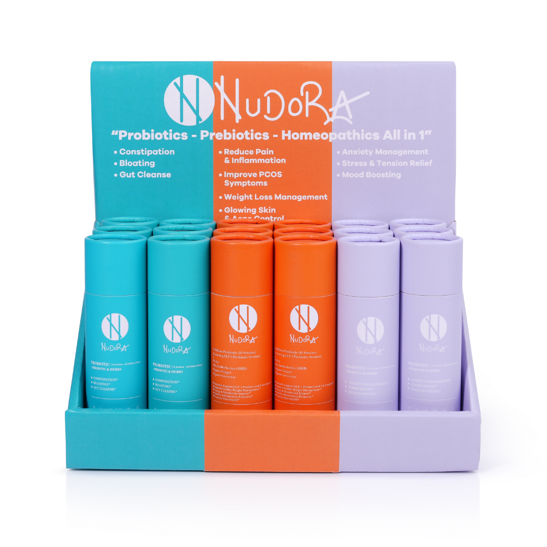 30 Nudora "NUEVO" Naranja : Apoya naturalmente la producción de GLP-1 y frena el apetito, apoya el control de peso saludable, apoya la energía y el metabolismo, la respuesta inflamatoria saludable y promueve la salud de la piel con 10 cepas probióticas (50 mil millones de UFC), prebióticos, dihidroberberina (DHB), jengibre orgánico y té verde orgánico .