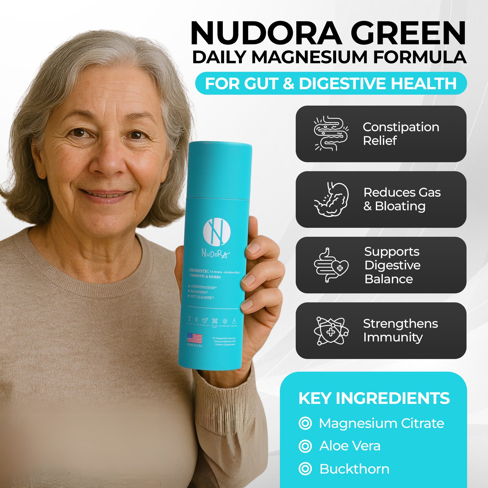 Nudora Green gets your gut moving naturally. Magnesium and aloe vera relieve constipation fast. Probiotics restore balance, while senna and buckthorn gently cleanse your system. No harsh laxatives—just natural, daily digestive support to keep you regular and feeling light.